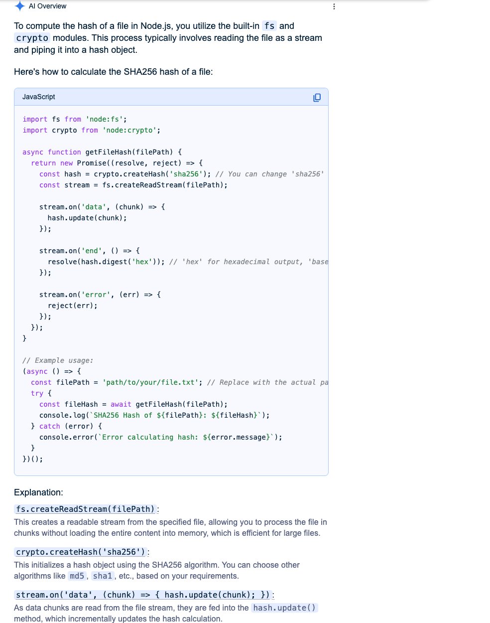 "snippet":"const crypto = require('crypto');\nconst fs = require('fs');\n\n/**\n * Calculates the SHA256 hash of a given file.\n * @param {string} filePath - The path to the file.\n * @returns {Promise<string>} A Promise that resolves with the hexadecimal hash.\n */\nfunction calculateFileHash(filePath) {\n return new Promise((resolve, reject) => {\n const hash = crypto.createHash('sha256'); // You can change 'sha256' to 'md5', 'sha512', etc.\n const stream = fs.createReadStream(filePath);\n\n stream.on('data', (chunk) => {\n hash.update(chunk);\n });\n\n stream.on('end', () => {\n resolve(hash.digest('hex'));\n });\n\n stream.on('error', (err) => {\n reject(err);\n });\n });\n}\n\n// Example usage:\nconst filePath = 'path/to/your/file.txt'; // Replace with the actual path to your file\n\ncalculateFileHash(filePath)\n .then((hash) => {\n console.log(`SHA256 hash of ${filePath}: ${hash}`);\n })\n .catch((err) => {\n console.error(`Error calculating hash: ${err.message}`);\n });"