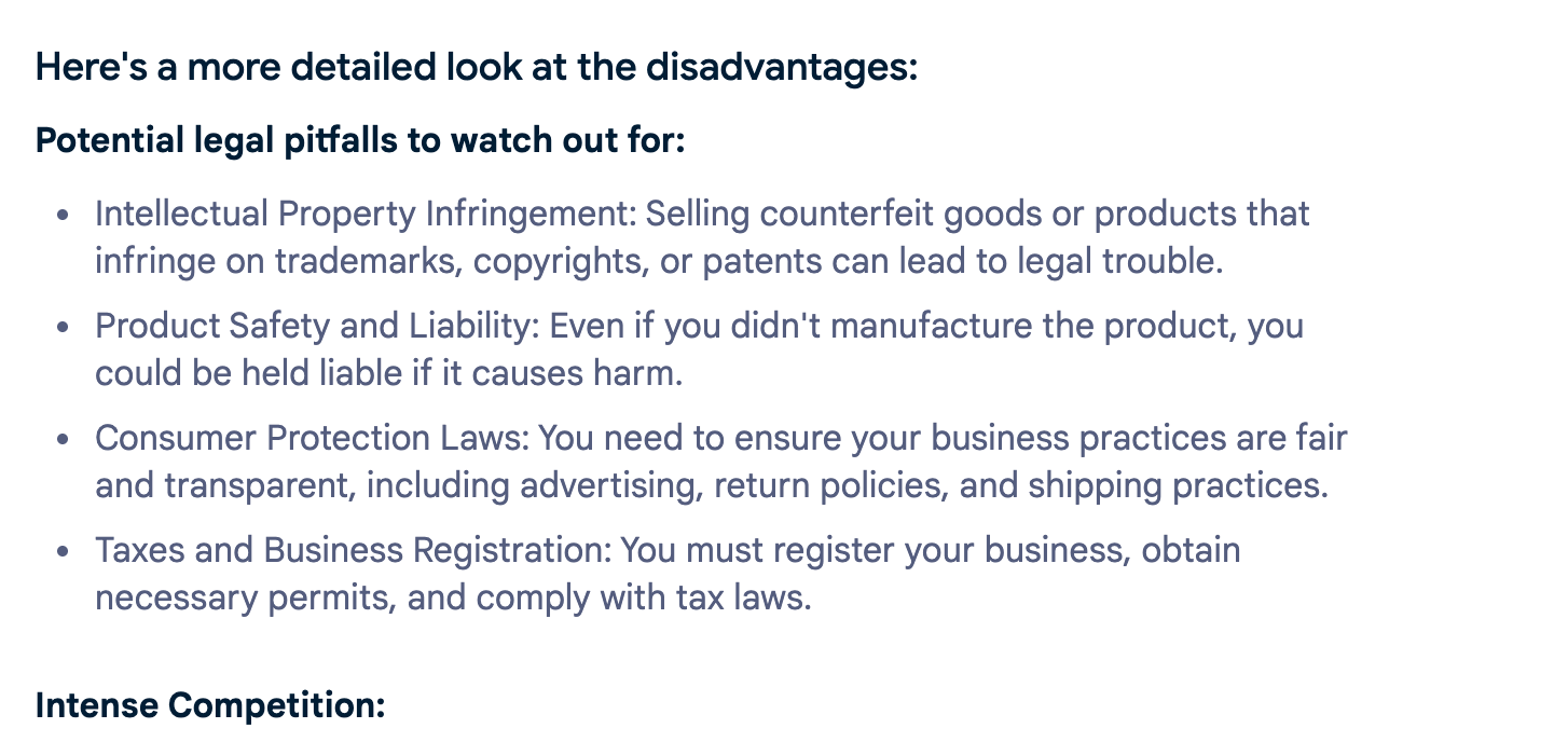"snippet":"Intellectual Property Infringement: Selling counterfeit goods or products that infringe on trademarks, copyrights, or patents can lead to legal trouble.",